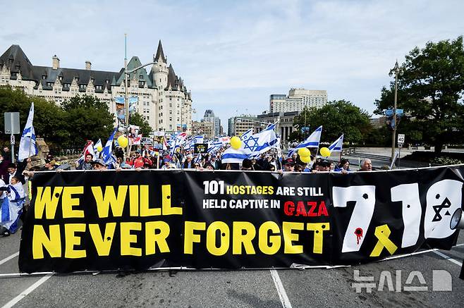 [오타와=AP/뉴시스] 가자 전쟁 발발 1주년을 하루 앞둔 6일(현지시각) 캐나다 오타와에서 이스라엘 인질들의 석방을 촉구하는 친이스라엘 시위대가 시청에서 의회 언덕까지 행진하고 있다. 2024.10.07.