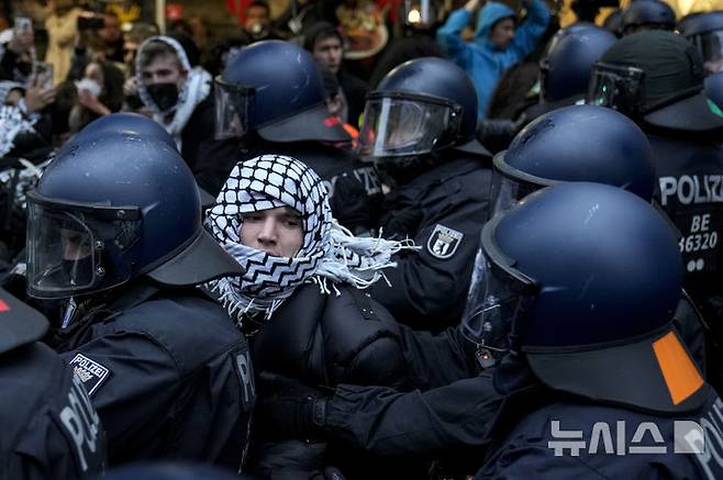 [베를린=AP/뉴시스] 가자 전쟁 발발 1주년을 하루 앞둔 6일(현지시각) 독일 베를린에서 경찰이 친팔레스타인 시위대와 충돌하고 있다. 2024.10.07.