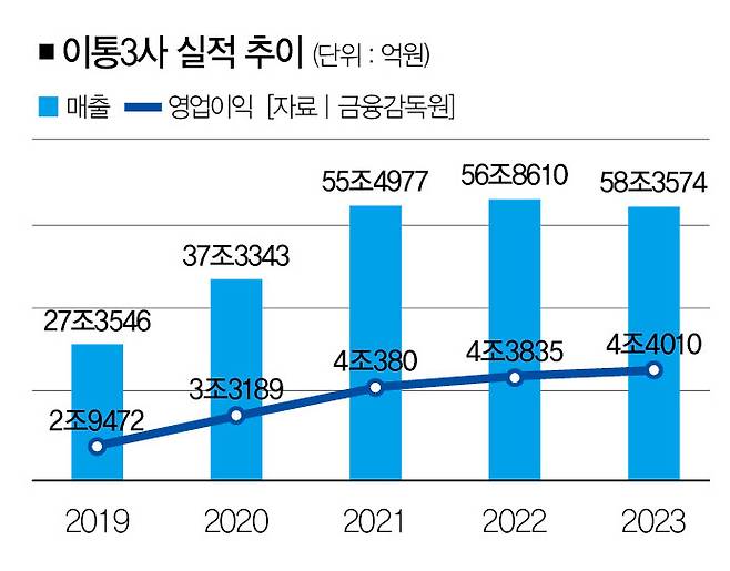 이렇게 정부가 가계통신비를 잡지 못하고 있는 동안 이통3사는 '실적잔치'를 누렸습니다. 5G가 상용화한 2019년 27조3546억원이었던 이통3사 총 매출은 4년이 흐른 현재 58조3574억원으로 113.3% 증가했습니다. 같은 기간 총 영업이익도 2조9472억원에서 4조4010억원으로 49.3% 늘었는데, 2021년(4조380억원)부터 3년 연속으로 영업이익 4조원을 돌파하는 대기록도 세웠습니다.