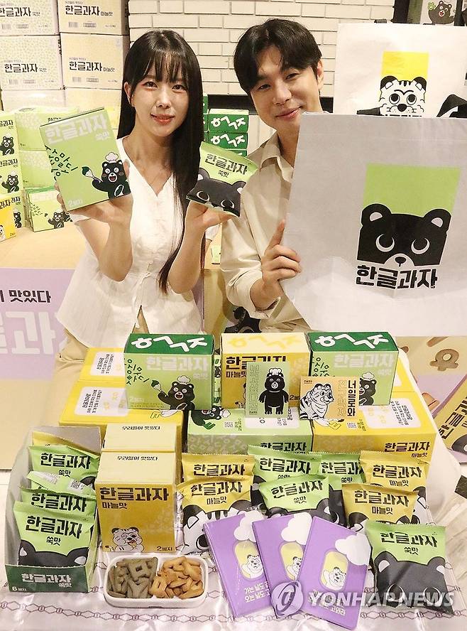 (서울=연합뉴스) 신세계백화점이 다가오는 한글날을 기념해 오는 10일까지 외국인이 만든 한글과자 팝업스토어를 선보인다고 7일 밝혔다. 사진은 모델이 팝업스토어를 홍보하는 모습. 2024.10.7 [신세계백화점 제공. 재판매 및 DB 금지]