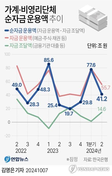(서울=연합뉴스) 김영은 기자 = 한국은행이 7일 공개한 자금순환(잠정) 통계에 따르면 가계(개인사업자 포함) 및 비영리단체의 올해 2분기 순자금 운용액은 41조2천억원으로, 직전 1분기(77조6천억원)보다 36조4천억원 적었다.