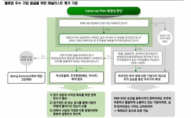 또한 잉여현금흐름(FCF)이 양의 값을 유지하고 무형자산을 제외한 PBR이 1 이하에서 거래되는지, 영업현금흐름(EBITDA)이 증가하고 있는지, 주주와 활발하게 소통하고 있는지 등을 밸류업 기업 선정 기준으로 삼았다.