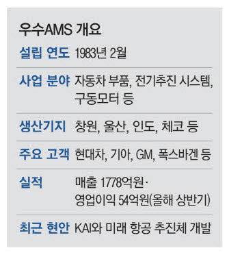 1983년 설립된 우수AMS는 자동차 부품 제조 사업과 알루미늄다이캐스팅 소재 사업, 전기추진 시스템·구동모터·전기전자 제어기술을 축으로 한 전동화 부문까지 다른 자동차 부품 회사에서는 보기 드문 다양한 사업구조를 갖추고 있다. 엔진이나 변속기에 들어가는 각종 기어류가 주요 제품으로, 현대차, 기아, 제너럴모터스(GM), 폭스바겐을 비롯한 글로벌 자동차 기업을 고객으로 두고 있다.
