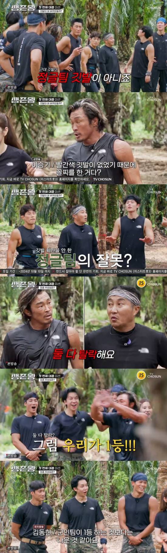 그 과정에서 정글팀은 1등을 차지했고, 실수로 피지컬팀 깃발을 사용했다. 이승기는 "사실 병만이 형 팀이 1등이지 않냐. 깃발이 저 깃발 아니다. 논쟁의 여지가 좀 있다"라며 못박았고, 피지컬팀 팀장 추성훈은 "나도 봤는데 처음에 녹색 그거 봤다. 우린 빨간색 가져가려고 생각하고 (상자를) 다른 거 찾고 있었다"라며 억울함을 토로했다.