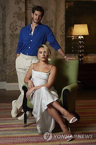 Andrew Garfield, left, and Florence Pugh pose for a portrait to promote the film "We Live in Time" on Tuesday, Sept. 10, 2024, in New York. (Photo by Matt Licari/Invision/AP) 091024130784, 21334631, MAY NOT BE LICENSED TO TABLOIDS, RESTRICTED EDITORIAL RIGHTS FOR BOOK PUBLISHERS, PLEASE CONTACT YOUR SALES REPRESENTATIVE