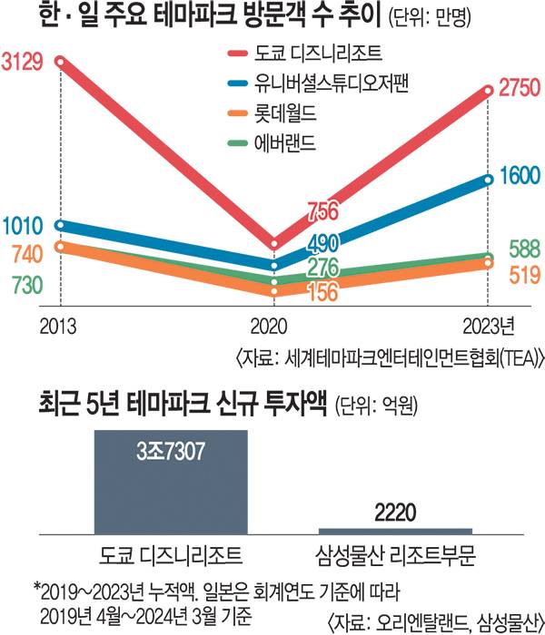 10년 전부터 저출생과 인구 감소, 중국 내 테마파크 확충 등으로 고민이 깊은 한·일 테마파크의 방문객 수 희비는 새로운 즐길거리를 지속해서 제공했는지로 갈렸다. 일본의 주요 테마파크는 수천억원 규모의 투자를 주기적으로 단행하며 외국인 관광객의 필수 방문 코스로 자리 잡았다. 반면 한국의 테마파크는 턱없이 부족한 투자로 일본과의 방문객 수 격차가 점점 벌어지고 있다.