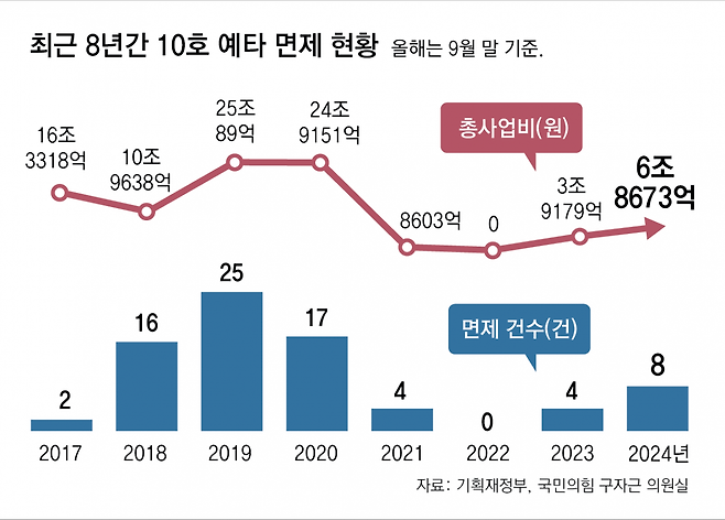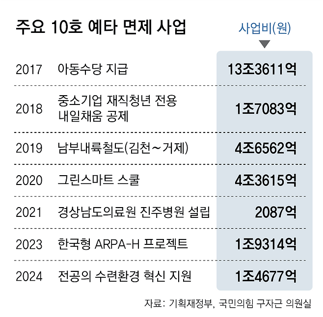 실제로 정부는 10호 예타 면제를 활용해 2018년 9조7000억 원 규모의 청년 일자리 대책(11건)의 예타를 건너뛰었다. 2019년 23조1000억 원 규모의 균형발전 프로젝트(22건), 2020년 4조9000억 원 규모의 디지털·그린 뉴딜 사업(8건)의 예타도 면제한 것으로 분석됐다.