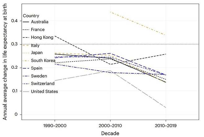 연구팀은 이 연구에서 현재 세계에서 기대수명이 가장 높은 일본, 한국, 호주, 프랑스, 이탈리아, 스위스, 스웨덴, 스페인 등 8개국과 홍콩·미국의 사망률 데이터를 이용해 1990년에서 2019년 사이 사망률과 기대수명 변화를 분석했습니다.