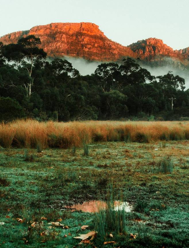 '장엄하다'는 첫인상은 단순히 규모에서만 비롯되는 건 아니다. 까마득한 역사도 한몫한다. 약 4억5,000만년 전 열대 기후 아래, 그램피언스 지역에서는 모래가 퇴적되어 사암층을 형성하기 시작했다. 그 사암층은 3억년 전 지각 변동으로 인해 한껏 압축되고 주름지며 기울어졌다. 그램피언스의 4개의 주요 사암 산맥이 만들어진 배경이다. 자글자글하게 주름진 늙은 산맥들. 그 잔줄의 깊이만큼 그램피언스는 유구한 세월을 살아냈다. 새벽녘 태양빛을 받으면, 산봉우리의 주름은 더 붉고 선명해진다. 자신의 존재를 저 스스로에게 입증해 보이듯 조용히 타오른다. 몹시 나이 들어, 사는 것의 황홀함을 아는 자연의 모습이다.