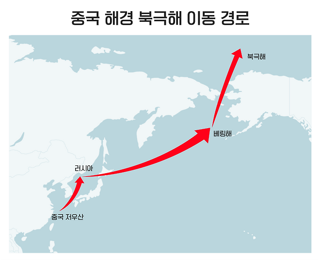 중국 매체에 따르면 중국 해경선 메이산(梅山)호와 슈산(秀山)호는 중국 저우산(舟山)을 출발해 러시아를 잠시 들른 뒤 미국 알래스카 근처 베링해를 지나 북극해에 도달했습니다.