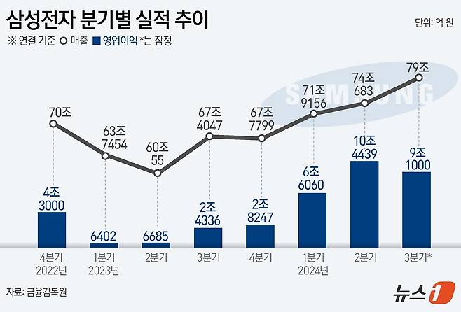 (서울=뉴스1) 김초희 디자이너 = 삼성전자(005930)는 3분기 매출액이 79조 원, 영업이익은 9조1000억 원으로 집계됐다고 8일 잠정 집계됐다고 공시했다.