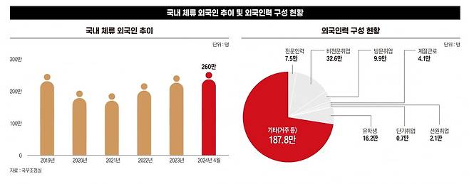 [외국인 300만 시대] 대한민국은 외국인 체류자 300만 시대를 눈앞에 두고 있다. 저임금·저숙련 일자리에 분포된 외국인 근로자의 업무는 단순해 보이지만 이들의 사회적 역할은 간단하지 않다. 저출산·고령화로 인한 일자리 공백을 메꾸고 조선업, 제조업 등 뿌리산업을 지탱하는 한 축이 됐다. “그냥 쉬었다”는 74만 명의 2030세대를 대신해 중소기업과 건설현장에서 뛰기도 한다. 외국인은 빠른 속도로 한국 사회 필수 인력으로 자리 잡았지만 이들을 향한 인식은 여전히 제자리걸음 중이다. 근본적인 질문도 존재한다. “한국인 청년 실업자가 이렇게 많은데 왜 외국인이 필요한지”, “이들이 창출하는 경제적 효과보다 사회적 비용이 크진 않을지”, “불법 체류자가 한국 사회 치안과 생활 수준을 해치진 않을지” 여전히 고민과 논란이 많다. 한경비즈니스가 이들에 대한 5가지 질문을 정리했다.