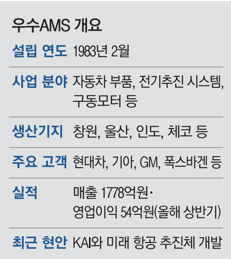 지난 1983년 설립된 우수AMS는 자동차 부품 제조사업과 알루미늄다이캐스팅 소재사업, 전기추진시스템·구동모터·전기전자 제어기술을 축으로 한 전동화 사업까지 다른 자동차 부품 회사에서는 보기 드문 다양한 사업구조를 갖추고 있다. 엔진이나 변속기에 들어가는 각종 기어류가 주요 제품으로, 현대차·기아, GM, 폭스바겐을 비롯한 글로벌 자동차 기업을 고객으로 두고 있다.