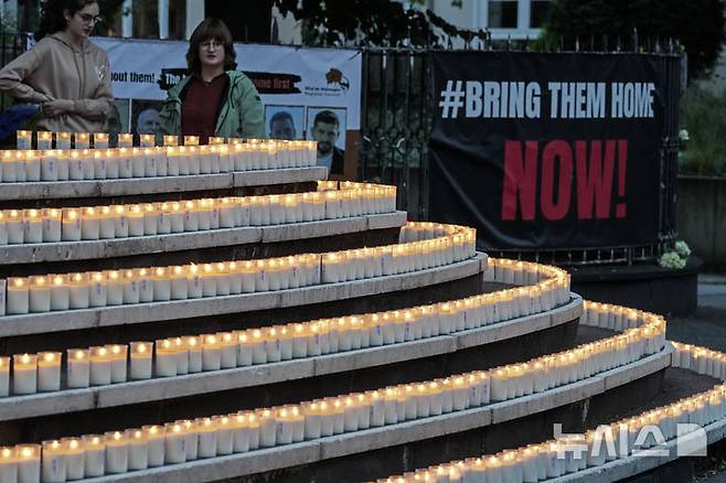 [뒤셀도르프=AP/뉴시스] 이스라엘-가자지구 전쟁 발발 1주년인 7일(현지시각) 독일 뒤셀도르프의 유대교 회당 앞에 전쟁 중 숨진 이스라엘인을 추모하는 촛불 1200개가 놓여 있다. 2024.10.08.