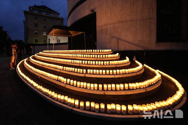[뒤셀도르프=AP/뉴시스] 이스라엘-가자지구 전쟁 발발 1주년인 7일(현지시각) 독일 뒤셀도르프의 유대교 회당 앞에 전쟁 중 숨진 이스라엘인을 추모하는 촛불 1200개가 불을 밝히고 있다. 2024.10.08.