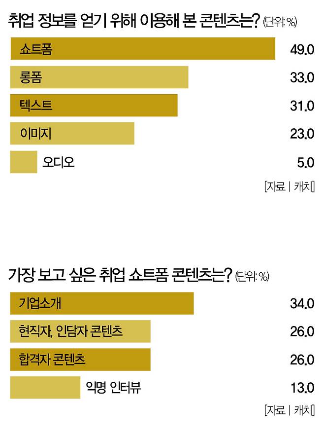 Z세대 취준생은 취업 정보를 어디서 얻고 있을까. 취업 콘텐츠 플랫폼 '진학사 캐치'가 Z세대 취준생 1360명에게 '취업 정보를 보기 위해 이용해 본 매체'를 물어본 결과, '쇼트폼(49.0%)'이 1위를 차지했다. 이어서 '롱폼(33.0%)' '텍스트(31.0%)' '이미지(23.0%)' '오디오(5.0%)' 순이었다.