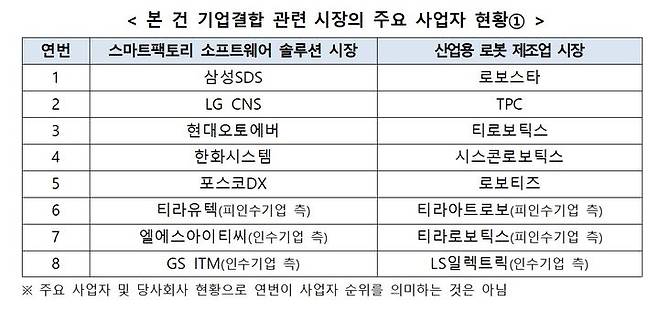 공정위 관계자는 "스마트팩토리 소프트웨어 솔루션 시장은 합산 시장점유율이 1% 내외이며, 삼성SDS와 LG CNS 등 유력 경쟁 사업자가 존재한다"며 "산업용 로봇 제조업 시장은 당사 회사 합산 시장점유율이 5%로 결합으로 인한 시장 집중도 증가분이 미미하다"고 말했다.