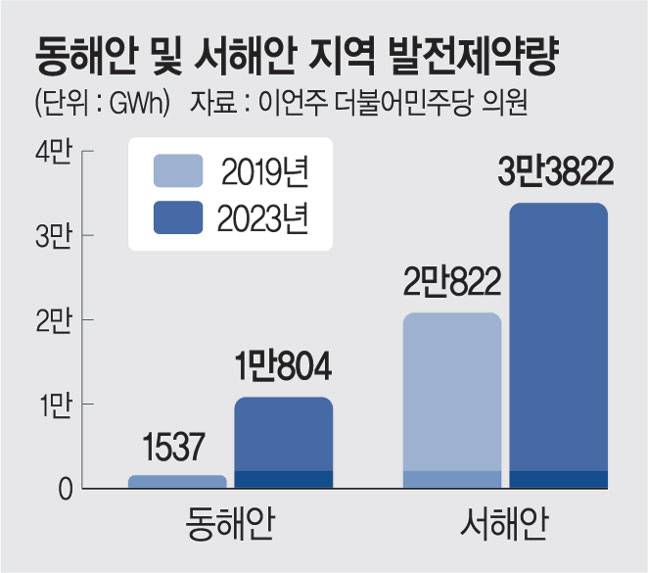 8일 산업통상자원부가 국회 산업통상자원중소벤처기업위원회 이언주(더불어민주당) 의원실에 제출한 자료에 따르면 지난 2019년 동·서해안 발전제약량은 2만2359GWh였으나 2023년에는 약 2배인 4만4626GWh로 늘었다. 지역별로 보면 특히 동해안 지역에서 발전제약이 큰 폭으로 늘었다. 2019년 1537GWh였던 동해안 지역 발전제약량은 지난해 약 7배인 1만804GWh로 늘었다. 같은 기간 서해안 발전제약량은 2만822GWh에서 3만3822GWh로 증가했다.