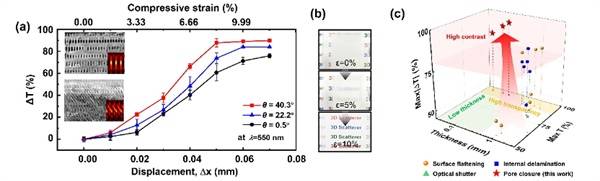 | ▲ 정렬 이방성 나노구조의 우수한 광학 특성 (a) 나노구조의 번형률에 따른 투명도 변화 비교 그래프 (b) 기존 투과율 변화 필름 시스템과 비교한 새로운 방식의 투명도 변화 시스템의 우수성 |