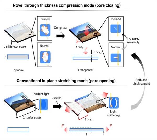 | ▲ 압축을 통한 투명도 조절 필름의 모식도 특정 방향으로의 이방성을 활용해 압축을 통한 투명도 조절 방식 (위) 과 기존 인장 응력을 통한 투명도 조절 필름 방식의 비교. |