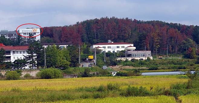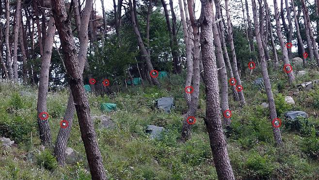 | ▲ 재선충에 감염된 소나무들을 잘라 2017년과 2023년 훈증해 비닐로 덮고, 주변에 남은 소나무들에 2024년 농약을 주입하고 명찰을 달았다. 그러나 재선충 예방 주사를 맞았지만 죽어가는 소나무들을 볼 수 있다. |