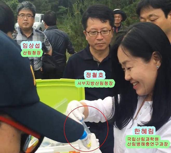 | ▲ 2016년 제주도에 백신 실험 현장. 현재 임상섭 산림청장과 정철호 서부지방산림청장과 한혜림 국립산림과학원 과장이 직접 재선충을 주입하며 실험에 참여했고, 그 소나무들이 살아 있다. |