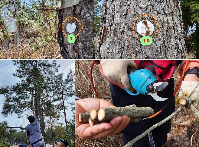 | ▲ 국립산림과학원이 표본으로 붙여 놓은 10그루 소나무 가지를 잘라 2016년 주입한 백신의 존재 여부를 확인했다. |