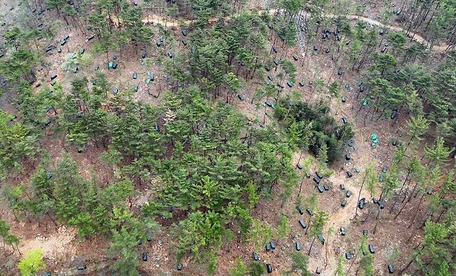| ▲ 재선충에 감염된 소나무들을 잘라 농약을 뿌리고 비닐로 덮은 소나무 무덤들이다. 주변의 소나무들은 농약 주사를 다 맞았다. 그러나 여전히 죽어가고 있다. |