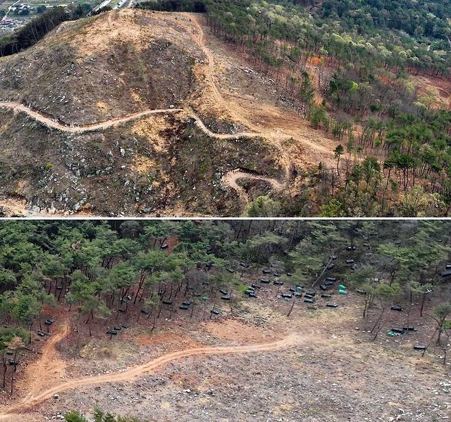 | ▲ 재선충을 더 이상 감당하지 못하자 싹쓸이 벌목하고 탄소 흡수 능력이 가장 낮은 일본 나무인 편백을 심었다. 이곳엔 그동안 농약 주사도 하고, 감염목을 베어내는 훈증도 수차례 했지만 아무 소용없었다. 아래 사진에 소나무 아래 감염목을 잘라 훈증해 놓은 소나무 무덤들이 보인다. |