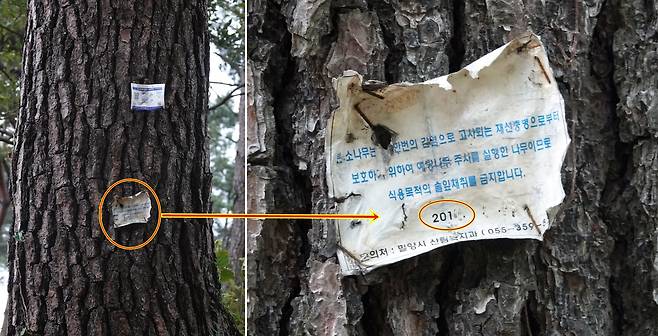 | ▲ 재선충 농약을 주입했다는 명찰을 두 개 달고 있다. 2017년 부터 재선충 농약을 주입하며 관리해 온 곳임을 의미한다. |