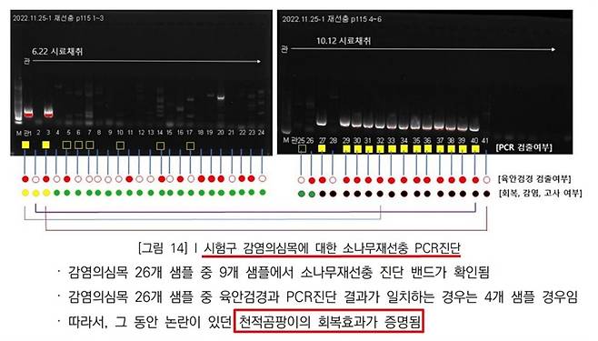 동일한 시료를 각 10개씩을 국립산림과학원과 성창근 교수가 각각 가져가 분석을 했다. 성창근 교수는 10그루의 소나무 가지 중 7그루에서 백신이 아직 살아 있음을 확인했다. 그러나 국립산림과학원은 동일한 소나무 가지를 가져갔음에도 불구하고 지금까지 묵묵부답이다.
