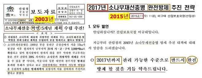 | ▲ 재선충이 전국으로 확산되고 있는데, 산림청은 재선충 방제 기술이 세계 최고 수준이라고 자랑하는 보도자료를 배포했다. |
