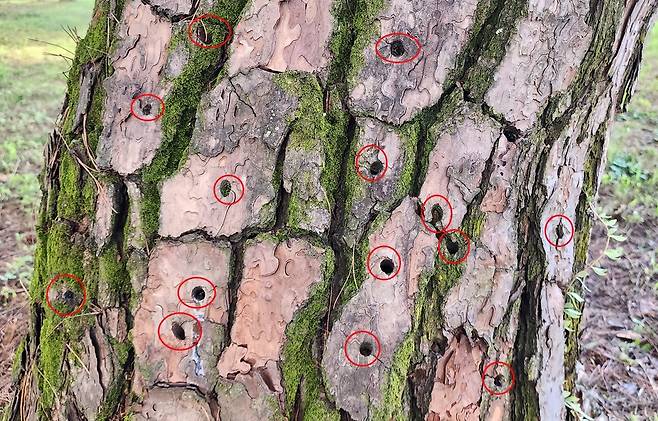 | ▲ 소나무 기둥엔 그동안 재선충 예방 주사를 맞은 구멍들이 숭숭 뚫려 있다. |