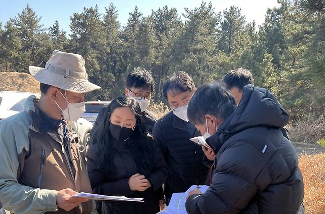 | ▲ 2022년2월 박현 국립산림과학원 원장과 한혜림과장과 연구원들이 제주도 실험 현장을 찾아와 2016년 재선충 3만마리를 주입하고도 살아 있는 소나무들을 확인하고 있다. |