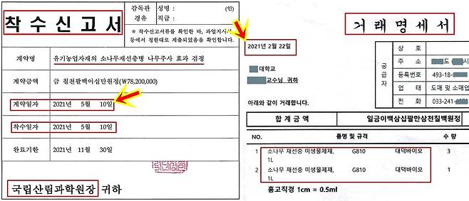 | ▲ 백신 실험을 위한 산림청의 계약서는 2022년5월10일인데. 용역 수행자인 모 대학의 백신 구입일은 2월22일이다. |