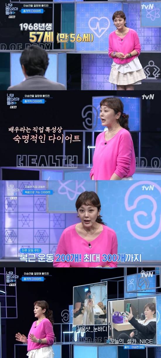 8일 방송된 tvN '너의 몸소리가 들려'에서는 MC 이승연이 배우 직업을 가진 뒤 꾸준히 다이어트에 관심을 갖게 된 사연을 말했다.