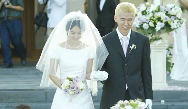 공개된 사진엔 션 정혜영 부부의 결혼식 풍경이 담겼다. 사진 속 부부는 순백의 버진로드를 걷고 있는 모습으로 금발머리의 션이 지금과는 다른 힙 한 매력을 발산했다면 정혜영은 어깨라인이 드러난 심플한 웨딩드레스로 여신의 자태를 뽐냈다.