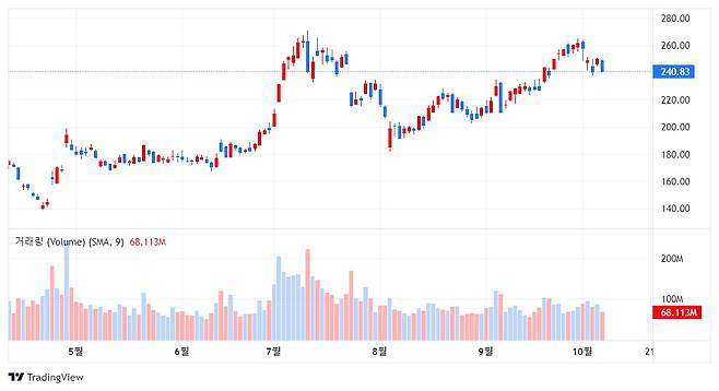 전 날 3,7% 하락했던 테슬라(TSLA)주가는 8일(현지시간) 미국증시 오전장에 1.4% 반등한 244달러에 거래되고 있다.
