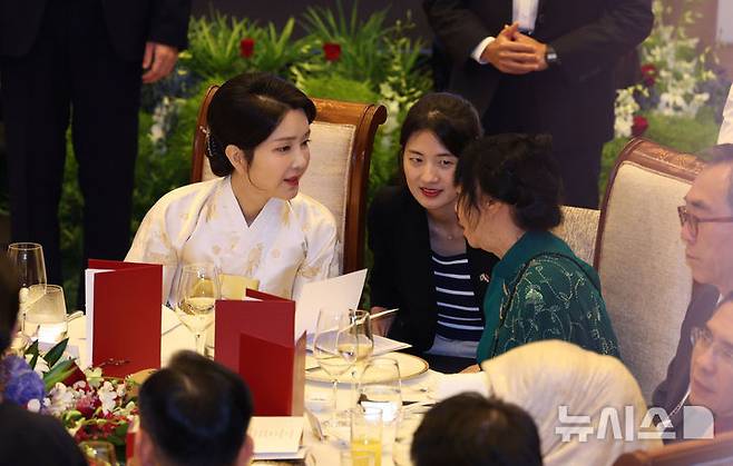 [싱가포르=뉴시스] 최진석 기자 = 윤석열 대통령 부인 김건희 여사가 8일(현지시각) 싱가포르 한 호텔에서 열린 타르만 샨무가라트남 싱가포르 대통령 주최 국빈 만찬에 샨무가라트남 대통령 부인 제인 이토기 샨무가라트남 여사와 대화하고 있다. 2024.10.08. myjs@newsis.com