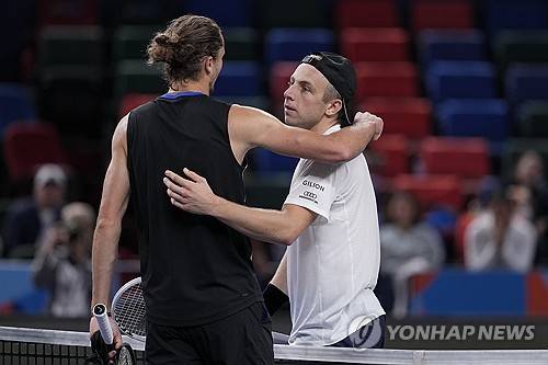 Alexander Zverev of Germany, left, is congratulated by Tallon Griekspoor of Netherlands after winning in the men's singles third round match of the Shanghai Masters tennis tournament at Qizhong Forest Sports City Tennis Center in Shanghai, China, Tuesday, Oct. 8, 2024. (AP Photo/Andy Wong)