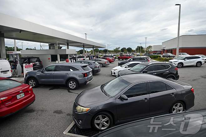(레이크랜드 AFP=뉴스1) 우동명 기자 = 8일 (현지시간) 허리케인 '밀턴'이 접근하는 플로리다주 레이크랜드에서 차량들이 연료를 보충하기 위해 주유소에 줄 지어 서 있다. 2024.10.09