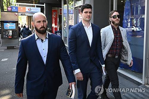 epa11649996 Jacob Hersant (C), and Thomas Sewell (L), both self-described Nazis, leave the Melbourne Magistrates' Court in Melbourne, Australia, 09 October 2024. Hersant was found guilty of intentionally performing the Nazi salute on 27 October 2023, about six days after Victorian laws came into effect banning the gesture. Hersant is the first Victorian found guilty of carrying out the Nazi salute and says he doesn't feel shame and intends to continue performing the gesture. EPA/JOEL CARRETT AUSTRALIA AND NEW ZEALAND OUT