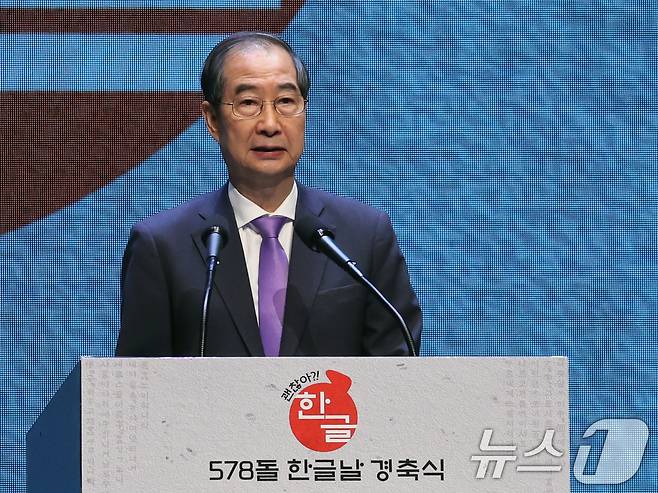 (서울=뉴스1) 황기선 기자 = 한덕수 국무총리가 9일 오전 서울 종로구 세종문화회관에서 열린 '제578돌 한글날 경축식'에서 축사를 하고 있다. 2024.10.4/뉴스1