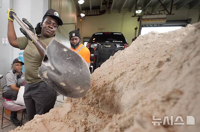 [노스마이애미비치=AP/뉴시스] 8일(현지시각) 미 플로리다주 노스마이애미비치에서 공공부문 근로자들이 허리케인 밀턴의 상륙에 대비해 주민들에게 배포할 모래주머니용 모래를 퍼 나르고 있다. 2024.10.09.