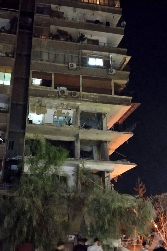 (알 마자 AFP=뉴스1) 우동명 기자 = 8일 (현지시간) 시리아 다마스쿠스 외곽 알 마자에서 이스라엘 군의 공습을 받아 폐허가 된 아파트가 보인다. 2024.10.09