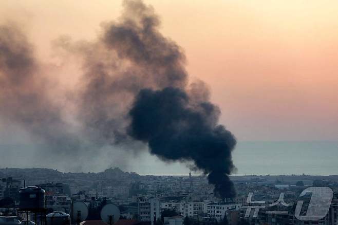 (베이루트 AFP=뉴스1) 우동명 기자 = 8일 (현지시간) 헤즈볼라와 갈등 중인 이스라엘 군의 공습을 받은 레바논 베이루트 남부 외곽에서 검은 연기가 솟아 오르고 있다. 2024.10.09