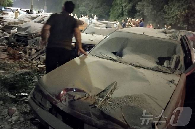 (알 마자 AFP=뉴스1) 우동명 기자 = 8일 (현지시간) 시리아 다마스쿠스 외곽 알 마자에서 이스라엘 군의 공습을 받아 파손된 차량을 주민이 살펴 보고 있다. 2024.10.09