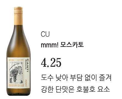 CU의 '음!(mmm!) 모스카토'가 3위를 기록했다. 이탈리아 대표 와이너리 '칸티(Canti)'와 손잡고 선보인 제품이다. 칸티는 전 세계 50개국 이상에 수출 중인 유명 와이너리다. 음! 모스카토는 한 병당 9900원의 막강한 가성비가 돋보인다. 은은한 꽃향기와 부드럽고 달콤한 맛이 어우러져 케이크, 과일 등의 디저트류나 치즈, 소시지 등 간단한 안주와도 잘 어우러진다. 도수가 낮아 가볍게 즐기기에도 좋다.