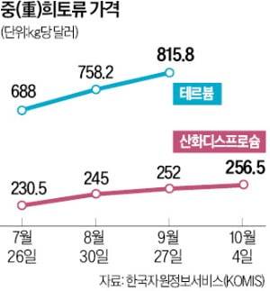 9일 한국자원서비스(KOMIS)에 따르면 지난 4일 기준 중국 상하이 금속거래소에서 거래되는 중희토류 산화디스프로슘 가격은 ㎏당 256.5달러(약 34만4700원)를 기록했다. 최저값을 기록한 7월과 비교해 약 11% 올랐다. 또 다른 중희토류인 테르븀 가격도 7월 ㎏당 688달러(약 92만4600원)에서 지난달 27일 815.8달러(약 109만6435원)로 20% 가까이 뛰었다.
