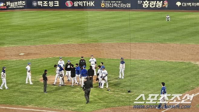강습 타구에 맞은 백정현은 그대로 쓰러졌다. 모두가 놀랐다. 타자 김헌곤은 뛸 생각도 하지 않고 마운드로 달려갔다. 다행히 백정현은 오래 걸리지 않고 몸을 일으켜 세웠다.